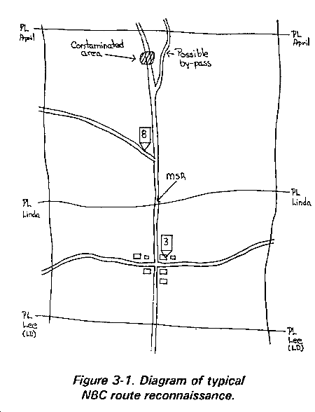 A unit, particularly an NBC recon unit, could be given the specific mission of conducting an NBC route reconnaissance. This mission is appropriate when the commander feels there is a high likelihood of contamination along the route. An NBC route recon proceeds faster than an NBC zone recon. The size of the route and the time available dictate the size of the recon element. Once contamination is detected, the recon element has the following options: