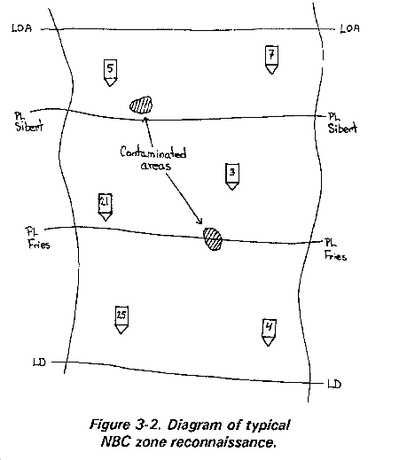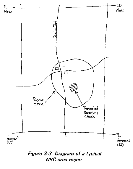 An NBC area reconnaissance is a directed effort to obtain detailed information concerning a specific area. An area recon is a specialized form of zone recon which proceeds faster since the effort is focused on a specific piece of terrain. This mission typically is assigned when employing a unit to reconnoiter a reported NBC attack area. Once contamination is detected, the recon element usually performs a survey to define the boundaries of the contamination.