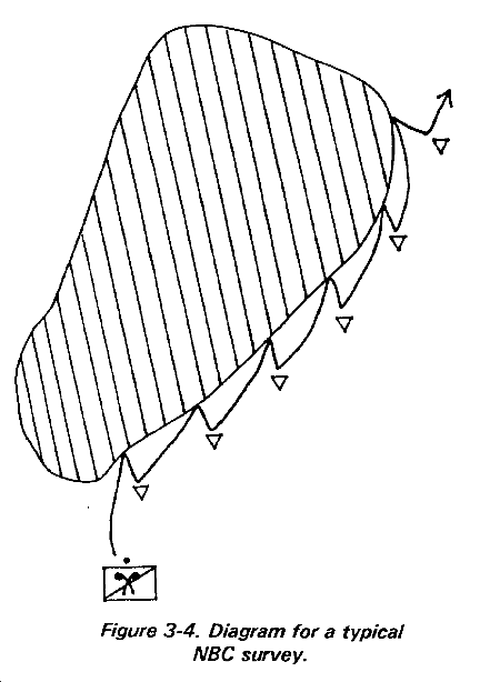 An NBC survey is a directed effort to obtain detailed information concerning a contaminated area. The extent of the contamination is determined and marked. This is a resource intensive operation typically conducted in rear areas to prevent units from unknowingly entering the contaminated area.