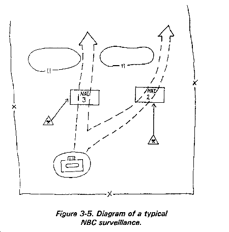 NBC surveillance is the systematic observation of surface areas to detect NBC attacks and hazards. All units perform a type of NBC surveillance-monitoring. Units monitor their areas to provide early warning by using the automatic chemical agent alarm. Units can be given the mission to perform NBC surveillance by observing specified areas for indications of a chemical attack. After observing the indications of an NBC attack, the recon element has the following options--