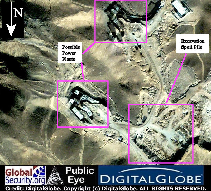 In the 2009 image, the pair of buildings in the 2005 image are replaced by a pair of constructions that might be interpreted as entrances, but which upon closer examination appear to be possibly/probably associated with an electrical power generation plant. The feature scale is about ten meters - that is, the square features to the left are 10 meters, and the tunnels to the right are 10 meters. evidently they are big enough to drive vehicles through them, since there is evidence of roads leading up to [and through?] them. But it is improbable that the facility requires four [or six, depending on how the associated but unconnected rectangular boxes are interpreted] large vehicular entrances. |
