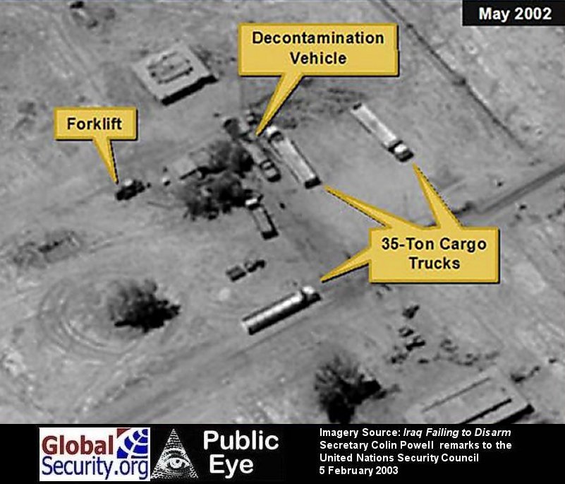 This May 2002 image was part of the February 5, 2003 Powell presentation to the United Nations Security Council. Powell drew special attention to the presence of large cargo trucks and a decontamination vehicle that he claimed were used to haul chemical weapons material.