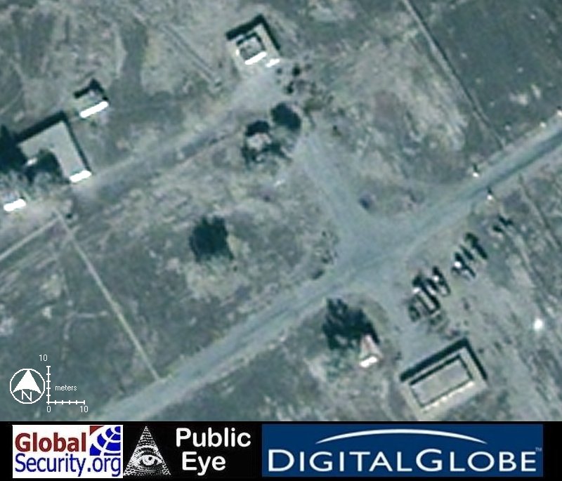 In this DigitalGlobe image from 11 November 2002, one can see a few cargo trucks visible that resemble those in the image that Powell used. However, these trucks are just over half the size (7m) of the suspicious cargo trucks in the briefing image (12m). The vehicle that Powell claimed was a "decontamination vehicle" is not present.